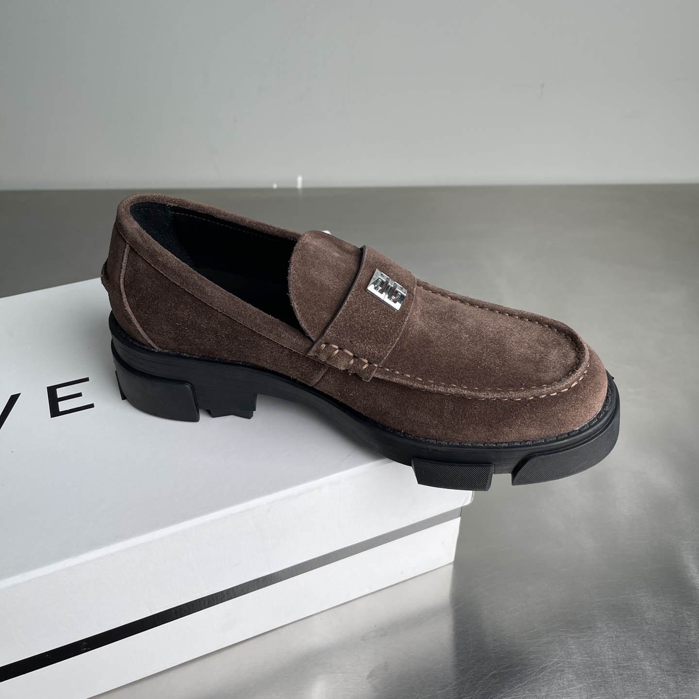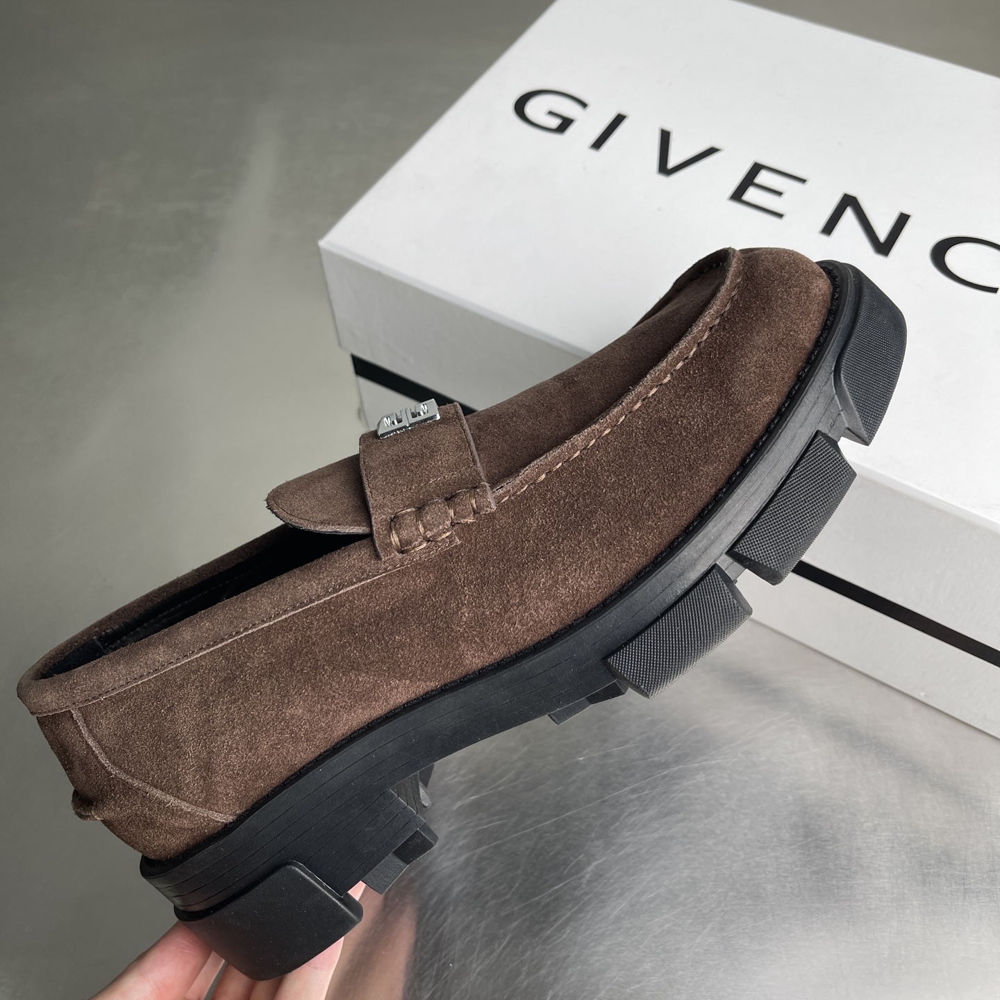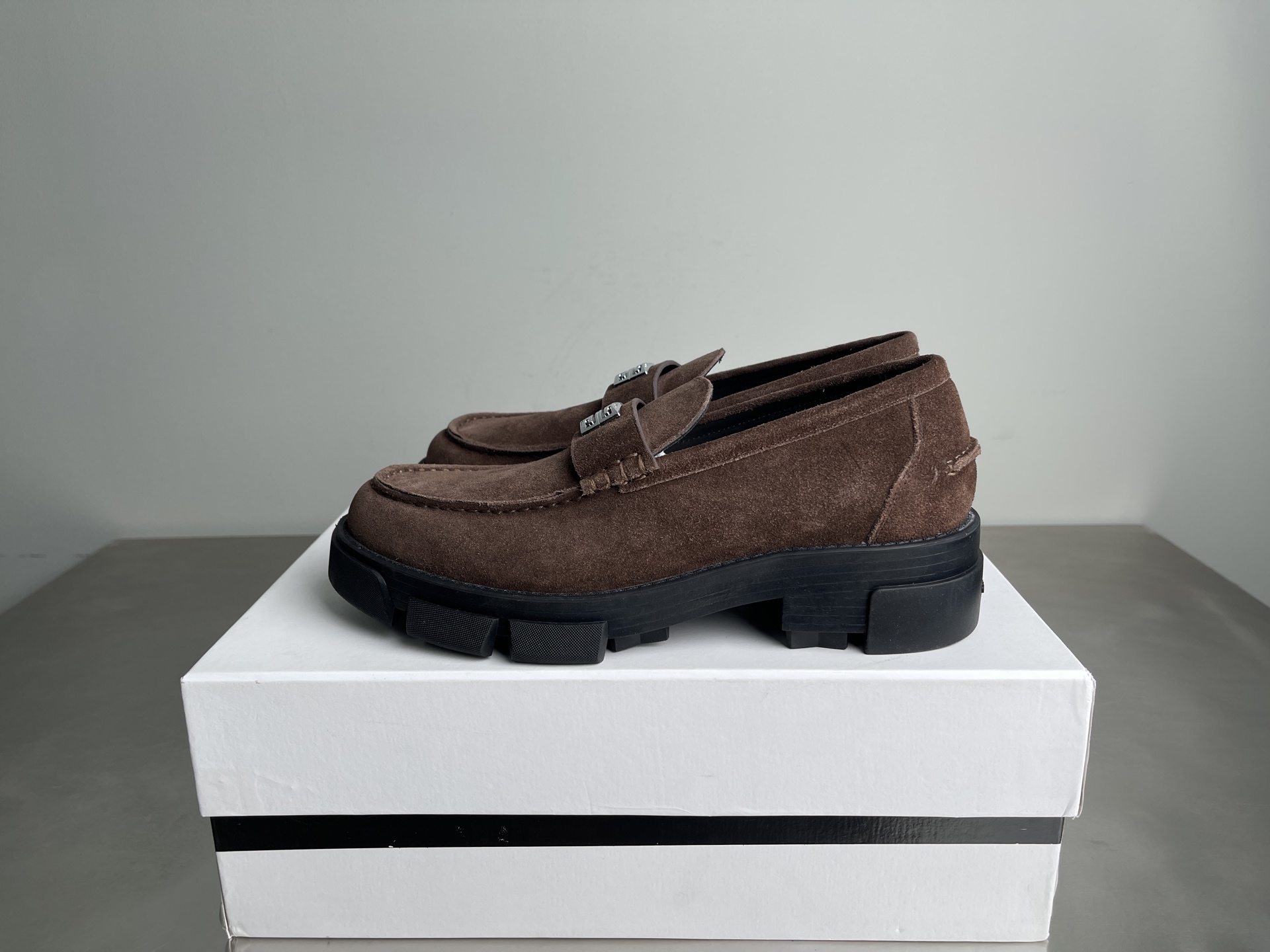 【莞产】纪梵希GIVENCHY 男士牛皮 麂皮厚底乐福鞋 这款鞋面采用牛皮 反绒麂皮(牛巴革),质感细腻复古,自带高级哑光感;鞋身侧面压印「GIVENCHY」品牌标识,低调辨识度拉满。 鞋后跟配备织带提环,方便穿脱,同时强化了工装风格。黑色锯齿状厚橡胶大底,是纪梵希厚底鞋的经典元素,既提供了约4-5cm的隐形增高效果,又增强了抓地力与造型感。复古德比鞋的正式感与街头潮流感。 尺码:39-44(38 45定做)