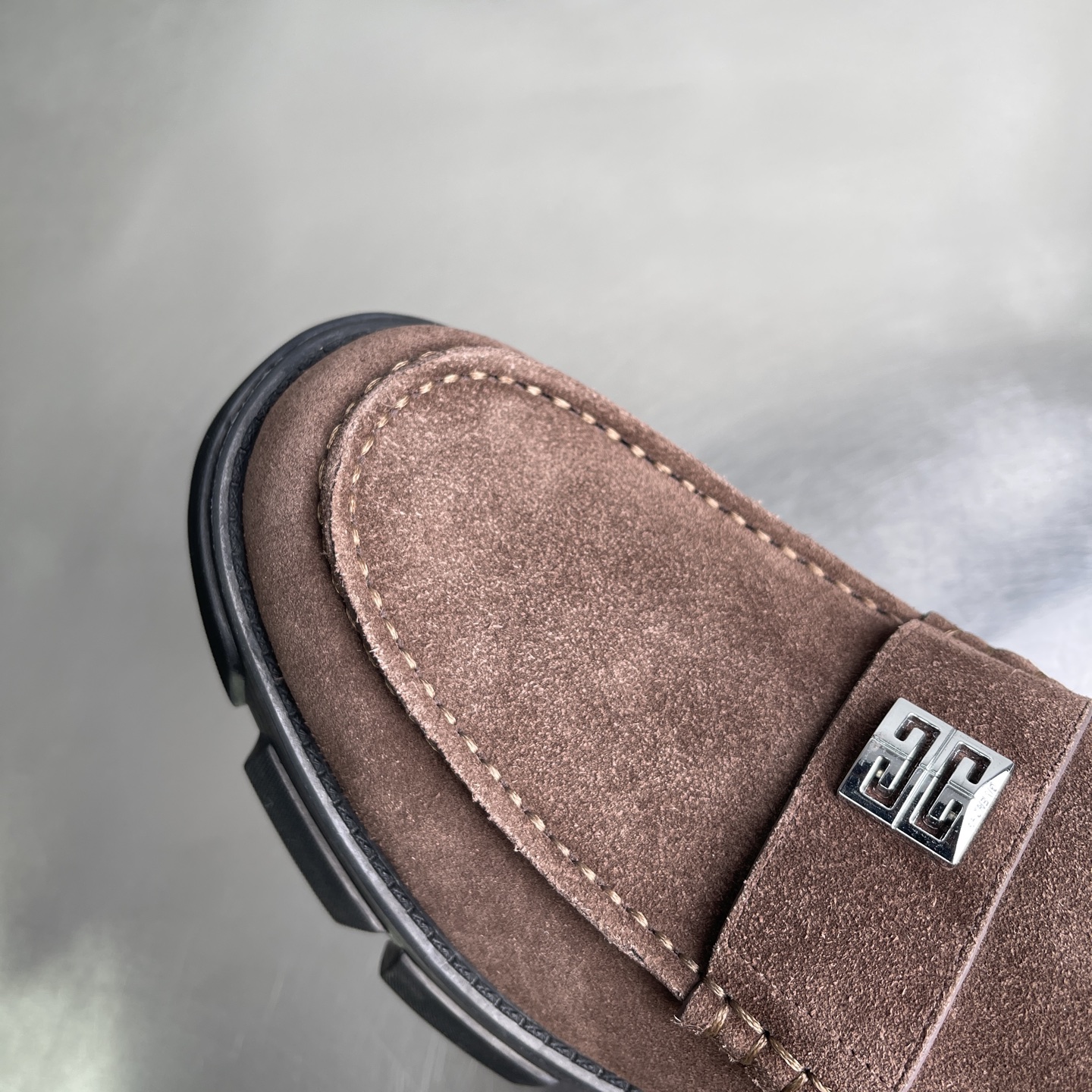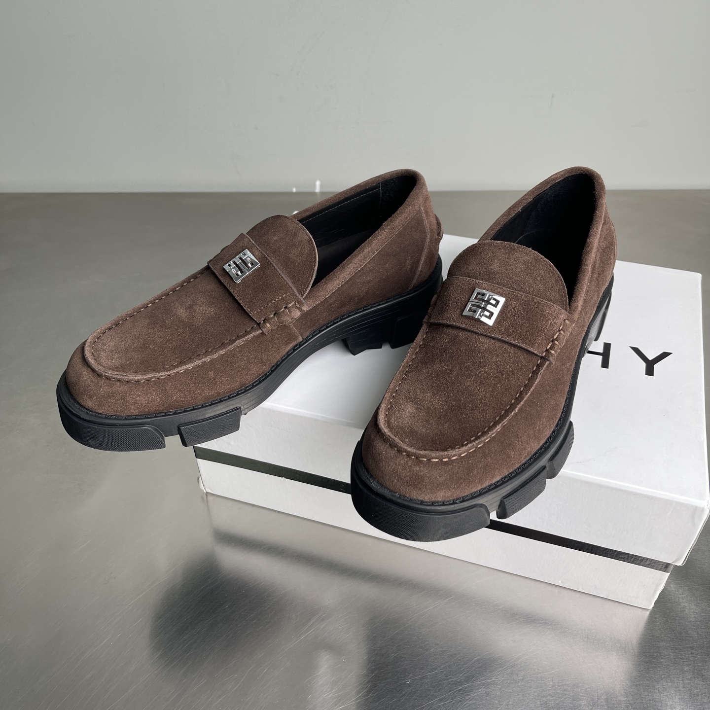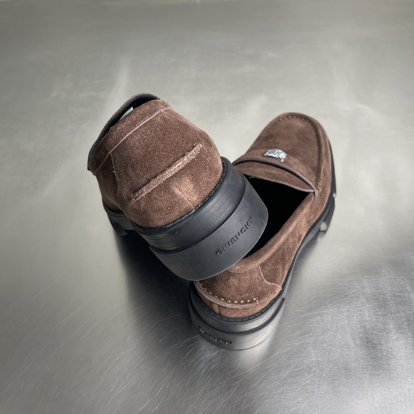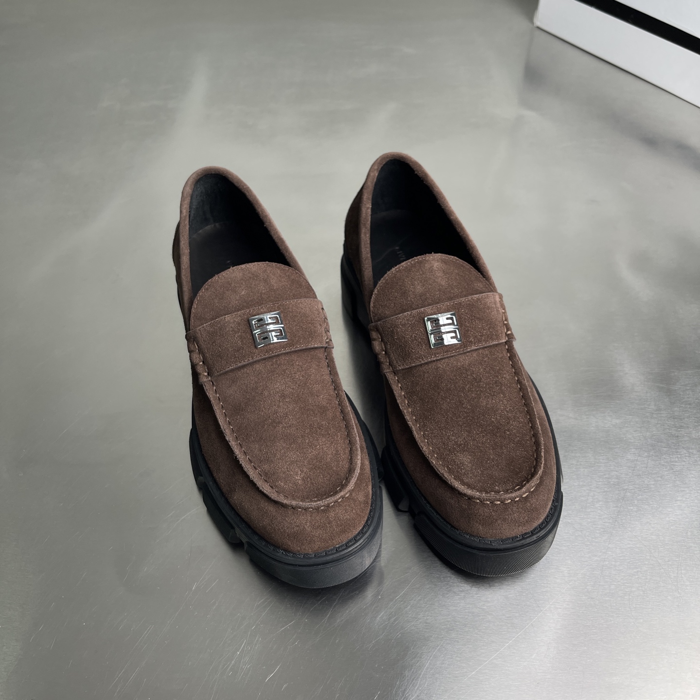 【莞产】纪梵希GIVENCHY 男士牛皮 麂皮厚底乐福鞋 这款鞋面采用牛皮 反绒麂皮(牛巴革),质感细腻复古,自带高级哑光感;鞋身侧面压印「GIVENCHY」品牌标识,低调辨识度拉满。 鞋后跟配备织带提环,方便穿脱,同时强化了工装风格。黑色锯齿状厚橡胶大底,是纪梵希厚底鞋的经典元素,既提供了约4-5cm的隐形增高效果,又增强了抓地力与造型感。复古德比鞋的正式感与街头潮流感。 尺码:39-44(38 45定做)