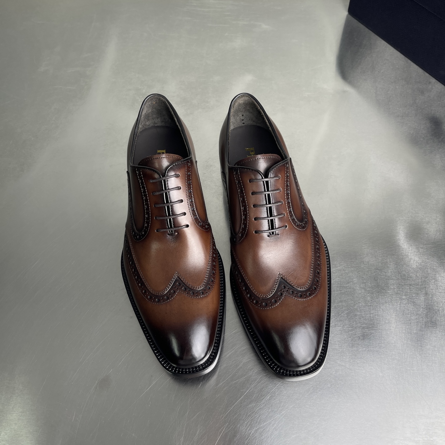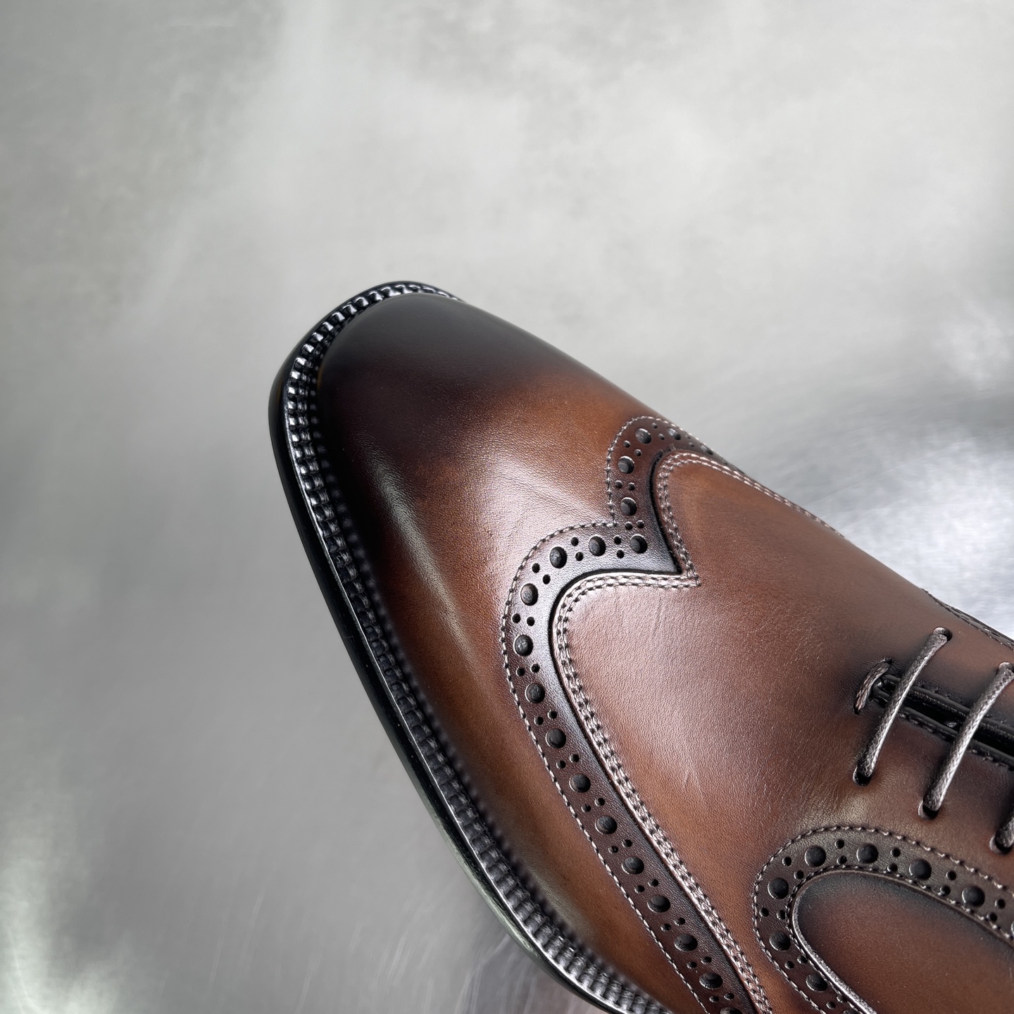 采用头层牛皮打造,表面有手工擦色的渐变棕调处理,布洛克雕花(翼纹冲孔)工艺精致,线条流畅。