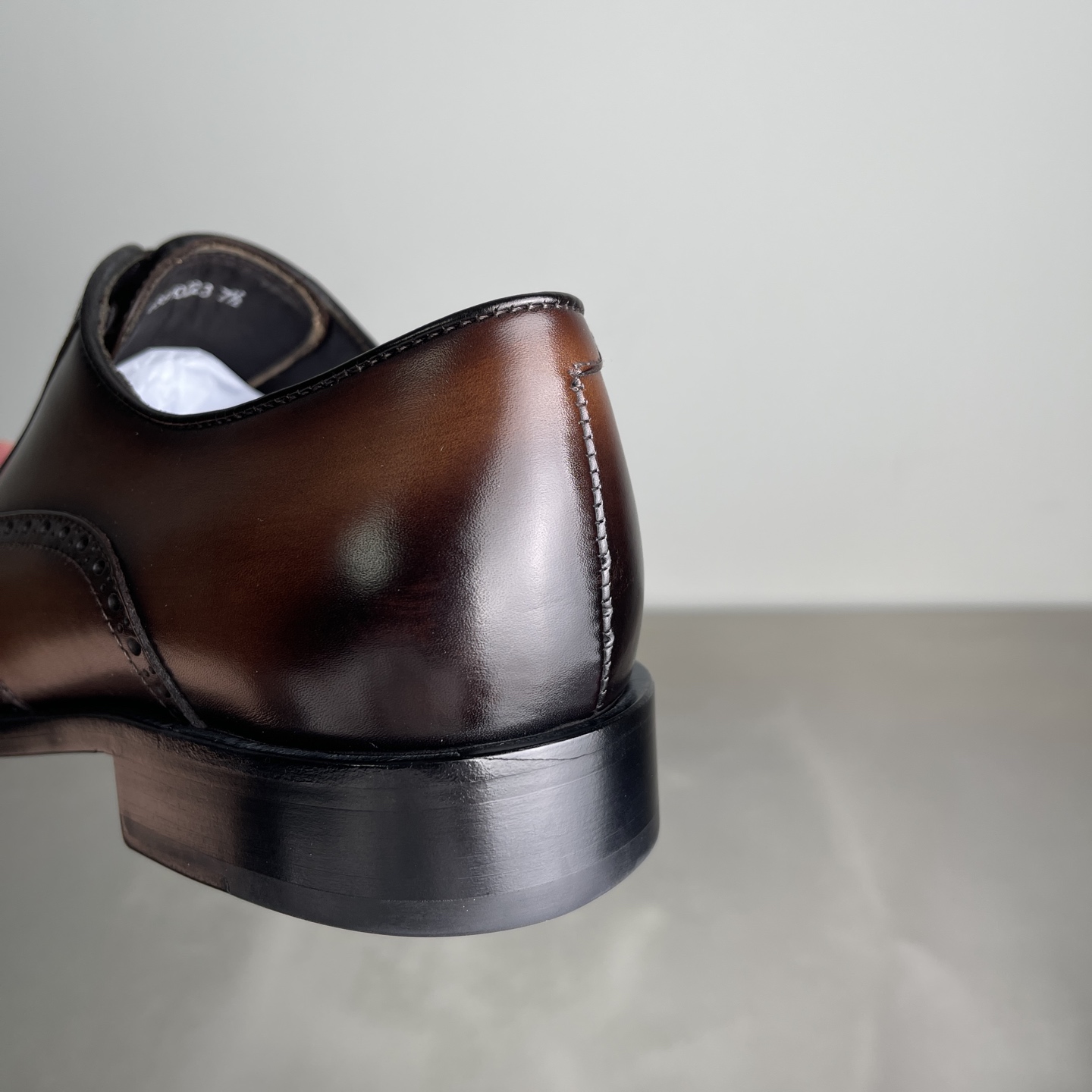 经典牛津鞋系带结构,尖头鞋型搭配低跟设计,鞋身孔洞与缝线的雕花布局符合意式正装鞋的优雅风格。